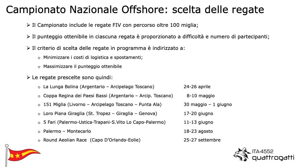 Quattrogatti, del nostro socio armatore Andrea Casini, parteciperà alle seguenti regate, previste secondo scelte volte a massimizzare i risultati minimizzando i costi della logistica: