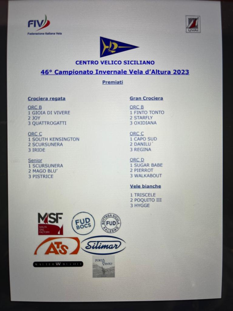 Vittoria di Caposud nella classe C di Grancrociera al 46° Campionato Invernale di vela di altura 2023 e un terzo posto di Quattrogatti in Crociera/regata.